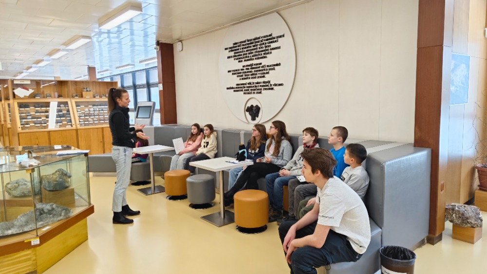 Hned po příchodu se nás ujala velmi milá paní průvodkyně. Rozdělili jsme se do tří týmů a dostali celkem šest pracovních listů plných fotografií a úkolů. Odpovědi jsme museli buď vylovit z paměti, nebo je vypátrat přímo ve vitrínách mezi vystavenými minerály. Celý pavilon jsme si díky tomu dobře prohlédli. U těch nejzajímavějších exponátů jsme se navíc zastavili a paní průvodkyně nám k nim prozradila další zajímavosti.
